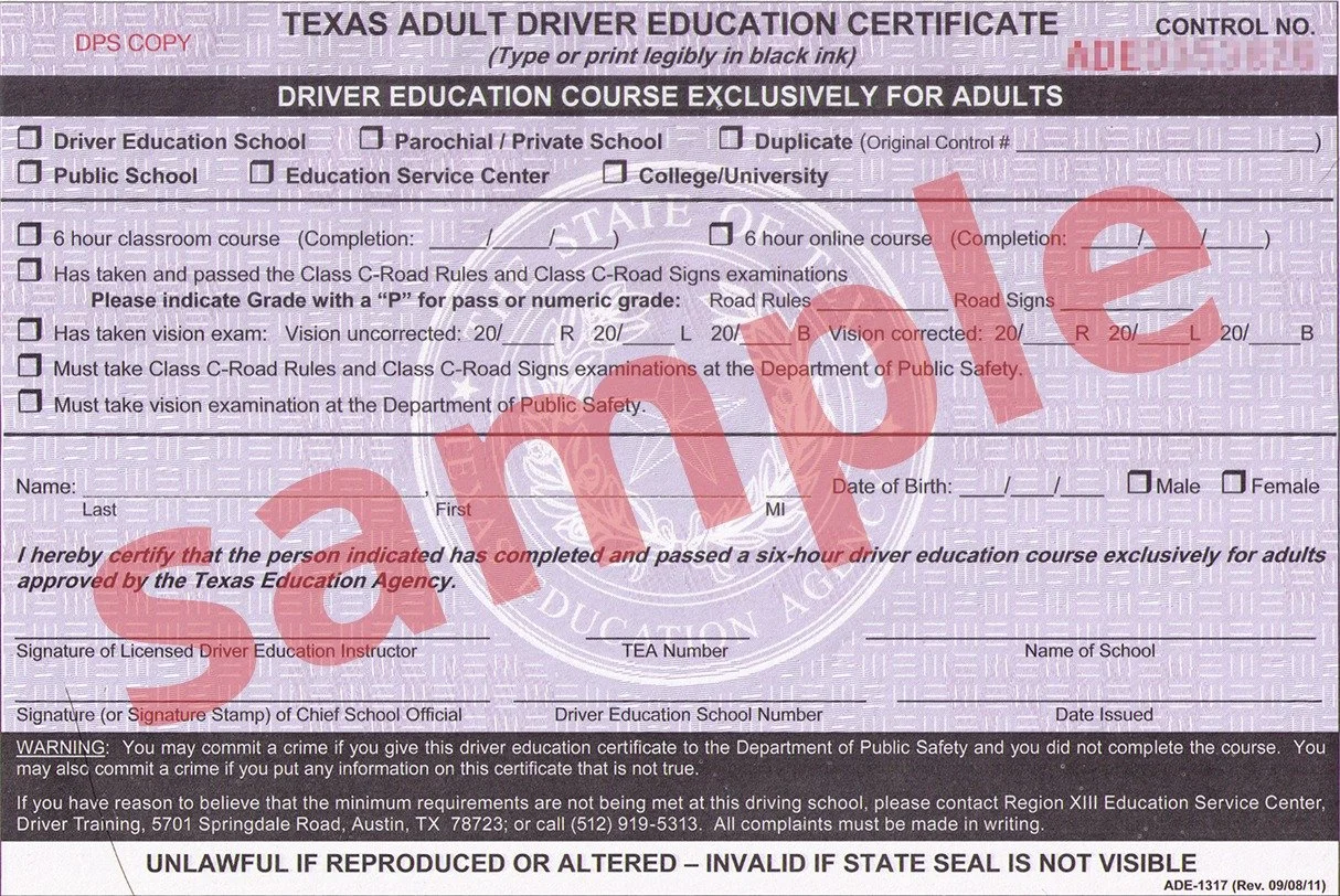 This drivers ed certificate can be from any Driving school online or in person. It must be labeled “For Driver License Only” not for Learners Permit and transfer box cannot be checked.